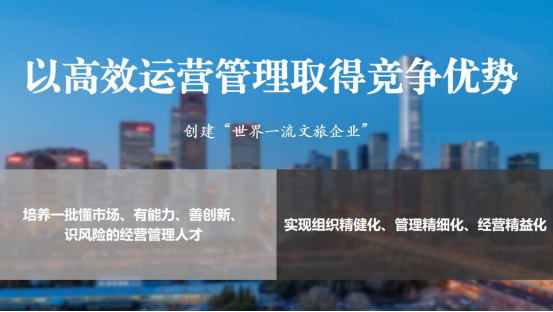 二是以高效运营管理取得竞争优势。当前,我们正在锚定目标,创建世界一流文旅企业,而高效的运营管理正是实现这一目标的基础。我们将继续有助于经营与管理之间的良性互动,解决好传统产业转型升级与新型业态不均衡开展的问题,培育一批懂市场、有能力、善创新、识风险的经营管理人才,有助于企业经营能力的整体提升。同时,我们进一步深入有助于组织改革,不断强化成本控制、盈利能力、产业结构、市场营销等各方面的能力建设,持续推进深化国企改革提升行动,实现集团组织的精简化、管理的精细化、经营的精益化,不断激发企业活力。
